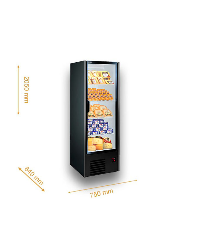 Модель має скляні дверцята, що відчиняються на себе, завдяки чому забезпечується зручний доступ до товарів як для продавця, так і для покупців. Ергономічний дизайн та оптимальні габарити дозволяють ефективно використовувати вітрину в магазинах різного формату — від невеликих крамниць до супермаркетів.