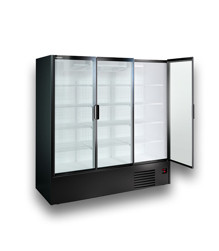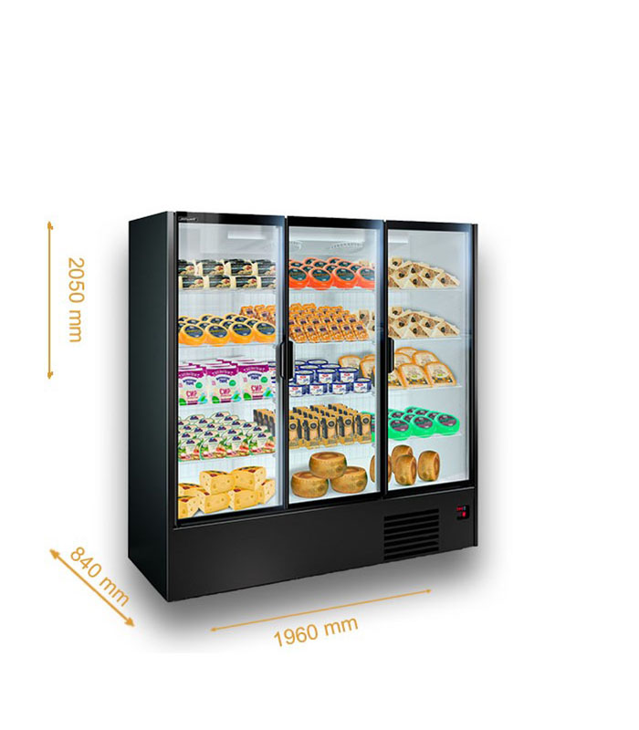 Модель обладнана трьома скляними розпашними дверима, які зручно відчиняються на себе, забезпечуючи швидкий доступ до продукції. Глибина викладки — 575 мм — дозволяє ефективно організувати простір та розміщувати велику кількість товару.